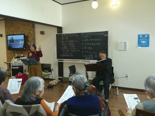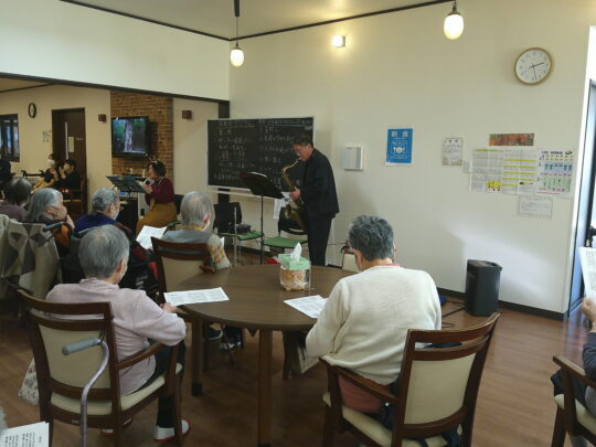 22日(月)ボランティアさんによるサックス・フルートの演奏会がありました。皆さん曲に合わせて歌を口ずさんでいました。